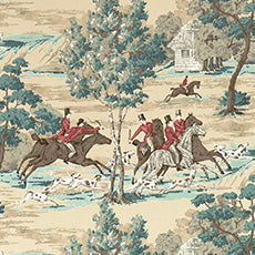 1948年のオリジナルハンドブロックプリントで描かれた狩猟の様子を、ペイント風のタッチで表現しました。実際に描いたようなタッチがドラマチックな空間を作り出します。