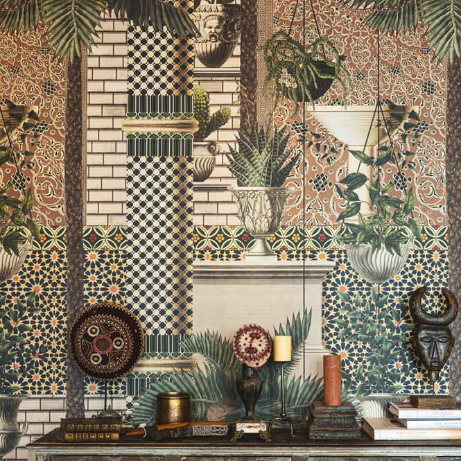 ユネスコ世界遺産のフェズ・エル・バリ。伝統柄のモロカンタイルと、椰子の木やハンギングプラントがあなたを小さなオアシスに連れて行ってくれます。デザインリピートにリズムを感じる壁紙です。