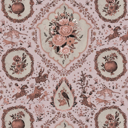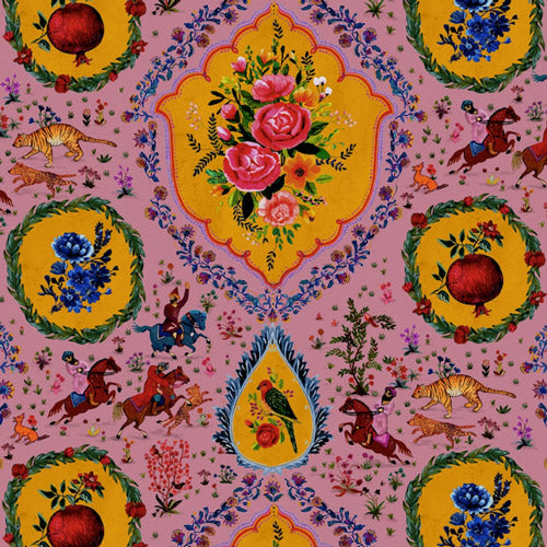 この壁紙はデザイナーのサミラ・モダレシファーの母国への愛を込めてデザインされました。デザイン名の由来はチョフガンという古代発祥の馬に乗りプレイするスポーツです。古代では貴族の遊びとして、今も品格を感じるスポーツ。サファイアカラーの花やルビーカラーのざくろがゴールドの背景に美しく映えます。インパクトがあり洗練されたアクセントクロスを探している人にぴったりなデザインです。優雅なスタイルをあなたのリビングで楽しんでみませんか?個性的な3色展開。
