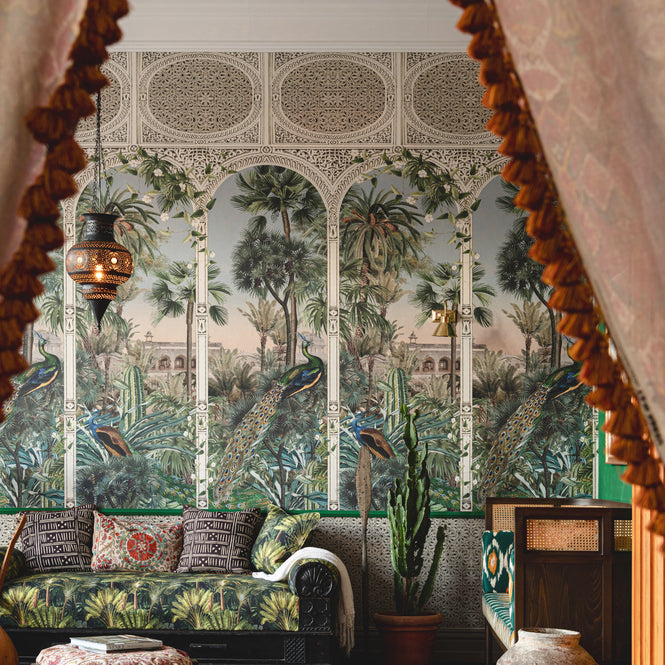 モロッコのリヤドは中庭付きの伝統的な宿泊施設です。ほとんどのリヤドは昔の上流階級の人が住んでいた家です。時を経てその家がリノベーションされて、ゲストハウスになりました。このデザインはそんなゲストハウスの窓からの景色を描きます。中庭のアーチの間に生茂っている植物と孔雀が砂漠にいることを忘れさせるくらいカラフルなオアシスを作ります。オアシスを眺める立派なリヤドにあなたの空間を変えてみませんか。