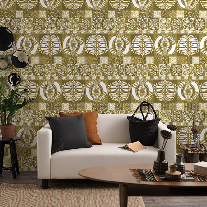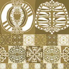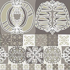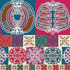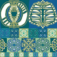 とても気に入っていたけれど、あえなく製品化しなかった図案が壁紙として生まれ変わりました。インパクトのある果実の断面のようなパターンと細かい図案が並んでいます。