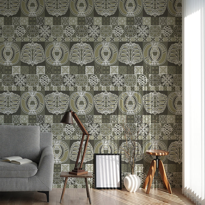 とても気に入っていたけれど、あえなく製品化しなかった図案が壁紙として生まれ変わりました。インパクトのある果実の断面のようなパターンと細かい図案が並んでいます。