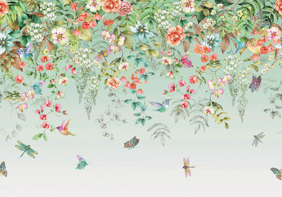 鮮やかな花々がたっぷりと垂れ下がるように描かれた「ETHEREAL FLORA」。色とりどりのハミングバードや蝶たちが花へと集まる様子が華やかで、背景にそっと溶け込む葉のシルエットがデザインに深みと上品さを添えています。