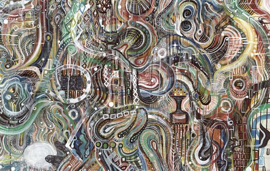 ライブペイント的に直感で描きあげたベースラインを軸に、そこから発想するイメージを描き込んだ作品。隣同士の線や色の関係性、その土台にはベースがあり一つに繋がっている作品です。