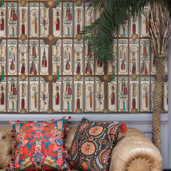 鮮やかなタッセル付きスィートルームのキーが、レセプションにセッティングされています。それぞれのキータッセルは刺繍などで細かく表現されその美しさに心ときめきます。