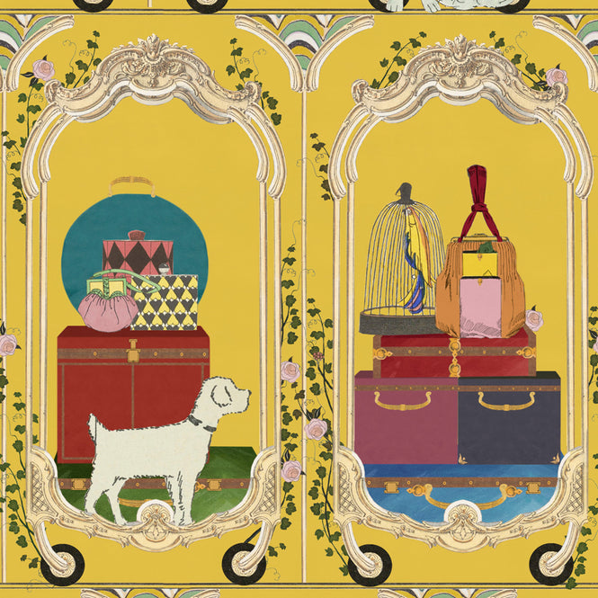 トロリーでカラフルな荷物と共に列車に運ばれるペットのゲージ。パステルの背景にビビッドな荷物の組み合わせで「FANCY TRIP」の遊び心が伺えます。連続柄を楽しめる空間、玄関、廊下、トイレなどにおすすめです。