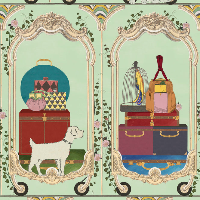 トロリーでカラフルな荷物と共に列車に運ばれるペットのゲージ。パステルの背景にビビッドな荷物の組み合わせで「FANCY TRIP」の遊び心が伺えます。連続柄を楽しめる空間、玄関、廊下、トイレなどにおすすめです。