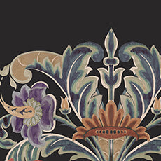 ブラックの背景色はドラマティックに柄を引き立たせています。