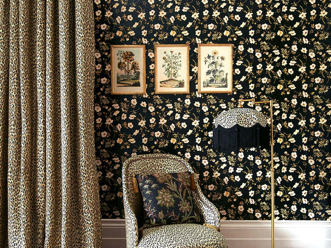 ブラックベースの花柄の壁紙は希少です。