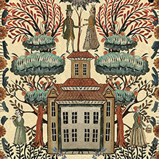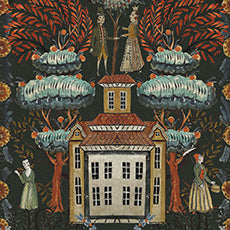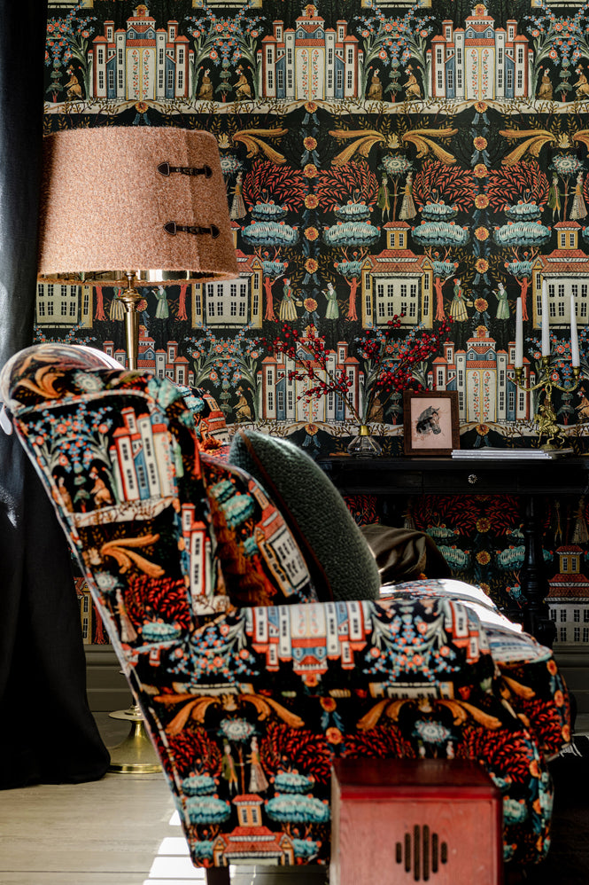 チロルの建築物と村の人々が幻想的な葉の天蓋の下で一緒になる魔法のようなデザインです。伝統的な衣装を着たバラ色の魅力的なキャラクターは、宝石のような色合いの木々や花に囲まれた架空の町に住んでいます。