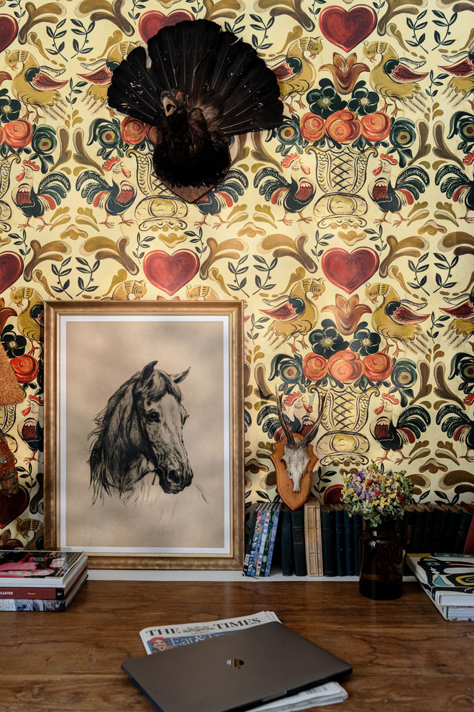 ブラッシーで美しい、生命力あふれるな民俗的なデザインは、空想の金色の鶏と活気を感じるおんどりが、咲き誇る花が挿された壷をとりまいています。伝統的なチロルの物語にインスパイアされたこのデザインは、『GOLDEN HENNE』の壁紙を支配するゴールドの色合いで描かれ、ルビーレッドのハートがロマンティックです。