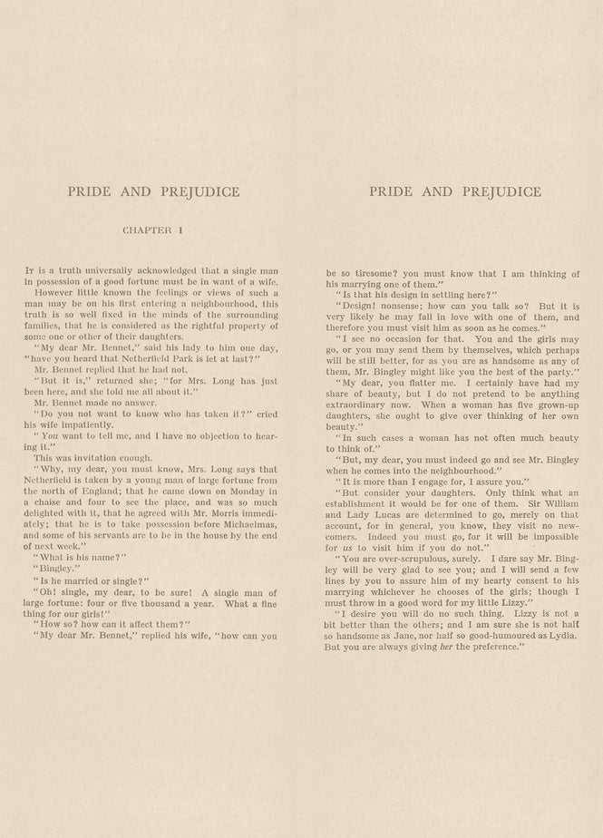 知的なエリザベスと無愛想なダーシーの物語に酔いしれてください。この古典的でロマンチックな小説の最初の数ページを記した壁面が、見る人を物語の中へと誘います。
