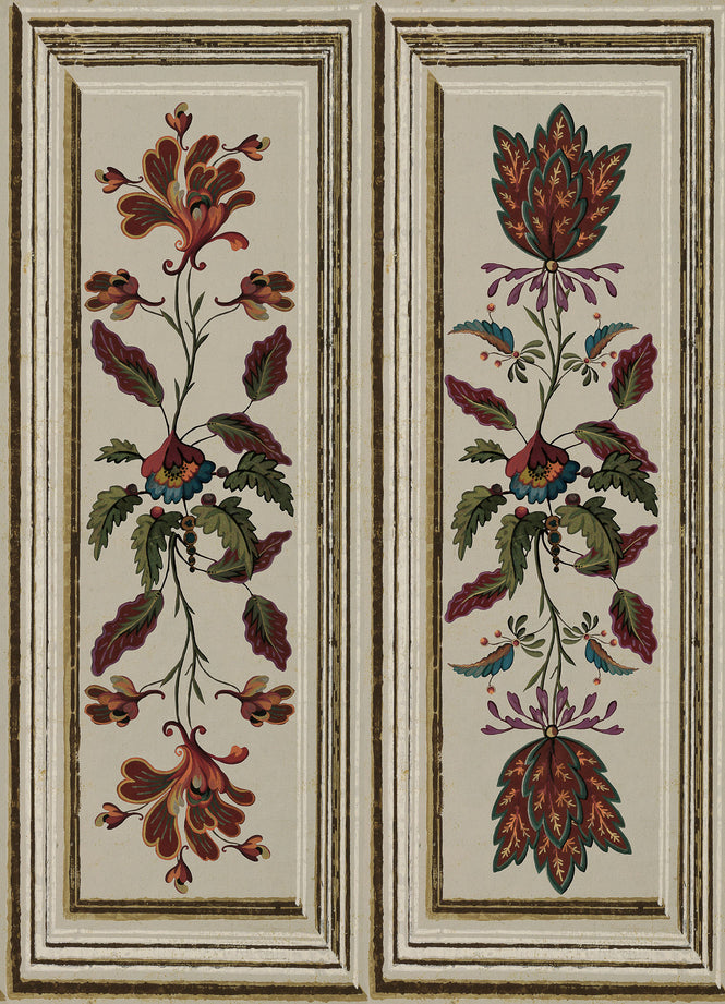 高山植物の絵画が立体的なパネルに描かれ、家具や家の壁に描かれた伝統的なチロル地方に伝わるインテリアの騙し絵。 トープ、アルペングリーン、ドラマチックなブラックの3色展開で用意されており、燃えるような様式化された花と繊細な葉が、説得力のあるパネルのような縁取りで囲まれ、奇抜で美しい壁紙を作り出しています。