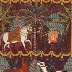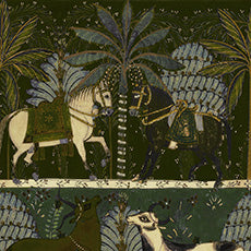 花飾りや刺繡のガーランドを纏った馬や牛、象の華やかなカーニバル。動物たちが踊っている雰囲気から音楽を感じてみて。