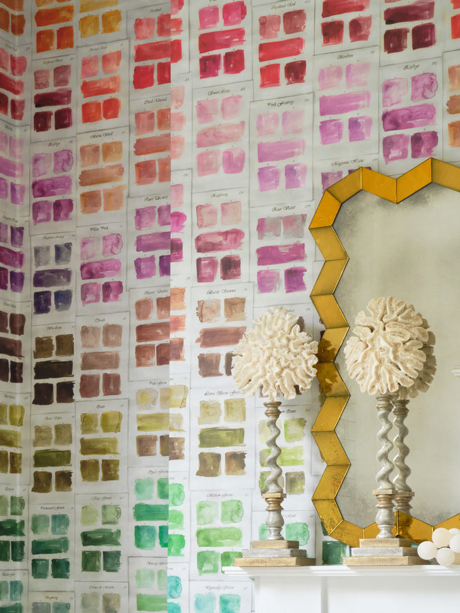 『PALLETE』は、もともとの『TRAITE DES COULEURS 』をリデザインしました。Boogert氏による1692年に発刊された手描きの色見本帳のページの見開きです。追加されたカラーパレットの鮮やかさは、壁にさらに楽しいグラフィックをもたらしますが、同時に「Traité des couleurs servant a la peinture a l'eau -水彩の研究所-」及び色彩の世界に敬意を表しています。Minnie Kemp(ミニー・ケンプ)のスタイリングをお楽しみください。