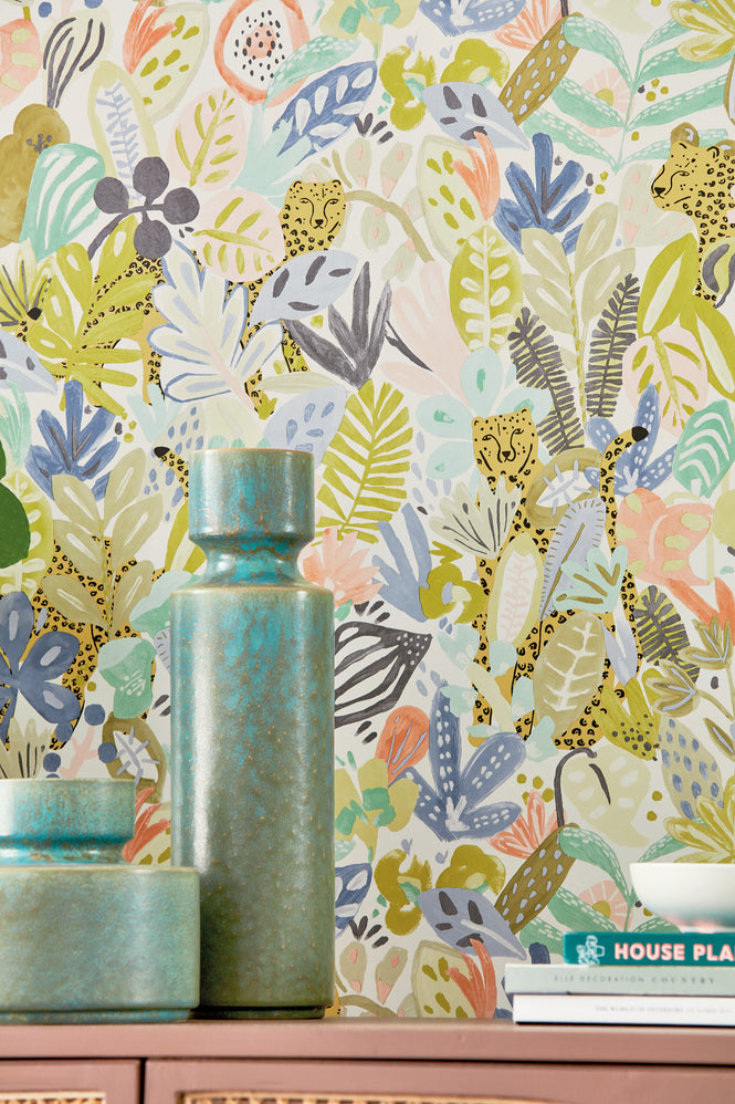 生い茂るトロピカルな葉の中に動物を描いたポップな壁紙。