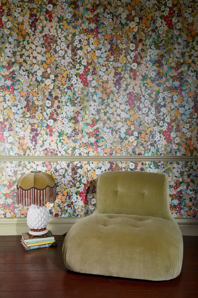 HOLLYHOCKSはクリムトのフラワーガーデンのペイントからインスパイヤーされたアメリカのアーティストKerry Simmonsの作品が壁紙にしたてられたものです。