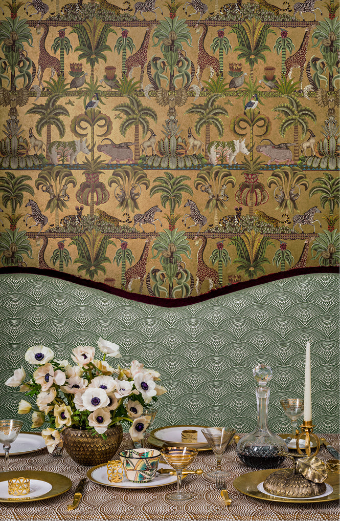 動物王国が、神秘を生み出す大地をボーダーデザインで表現され、数多くの動物たちが91cmのバーチカルリピートにつめこまれています。