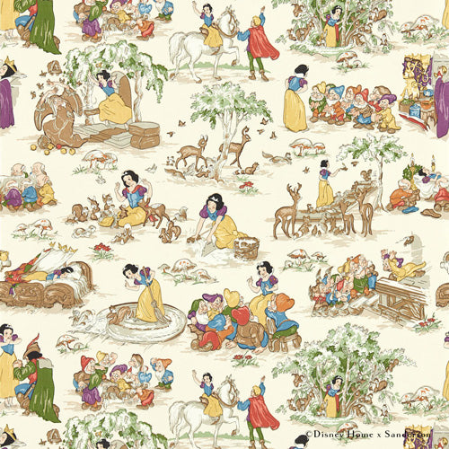 ディズニー初の長編映画「白雪姫」を記念して描かれたこの魅力的なデザインは1938年のもので、映画から切り抜かれたさまざまな愛らしいシーンが組み合わさっています。アーカイブデザインを正確に表現、またブロックプリントのディテールを残しながら、1930年代にインスピレーションを受けたカラーで表しています。