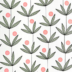 椰子の木のストライプの間にポップカラーな太陽のドット柄が織りなすリピートハーモニーが楽しめます。