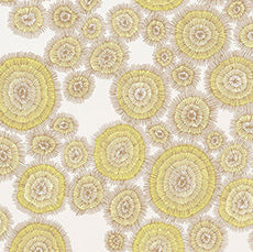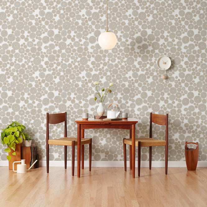 躍動的で表情豊かな「Burst」は、手描きの線がメタリックインクで、繊細な放射状のグラフィックサークルの上にプリントされています。この有機的な構成は、空間に遊び心をもたらします。