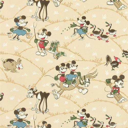 この牧歌的な風景は、ディズニーキャラクター「ミッキーマウス」と「ミニーマウス」がアウトドアを楽しんでいる様子です。1928年のオリジナルデザインにあるブロックプリントのディテールを表現し、アーカイブと同じカラーの2色展開です。