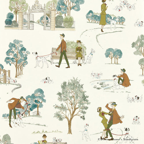 ディズニー映画「101匹わんちゃん」のストーリーを美しいデザインで表現。そして長い間人気の高いデザインをヴィンテージ風の遊び心を加えて表現しています。デザインはサンダーソンのアーカイブとオリジナル映画のさまざまなシーンを組み合わせています。ハンドブロックプリントの雰囲気とデザイン間の空白、それぞれがすべてのダルメシアンデザインを引き立てています。