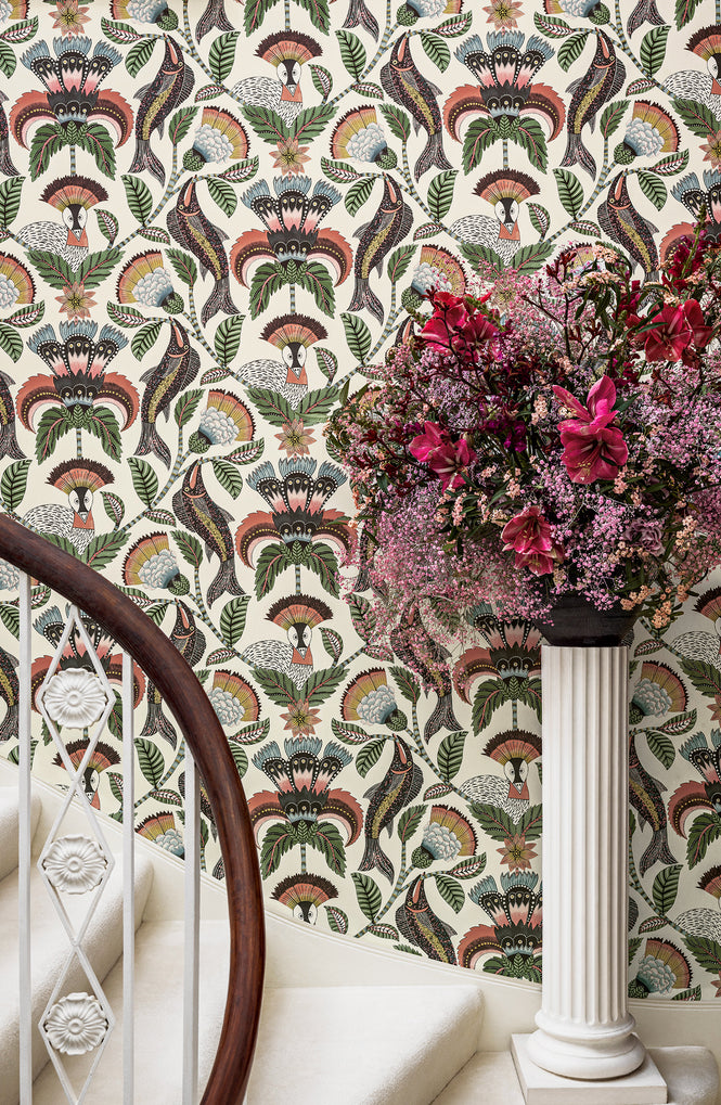 カンムリ鶴の正面顔は、ユーモアを兼ね備えたデザイナーのフィルターがかかっていてとてもチャーミングです。