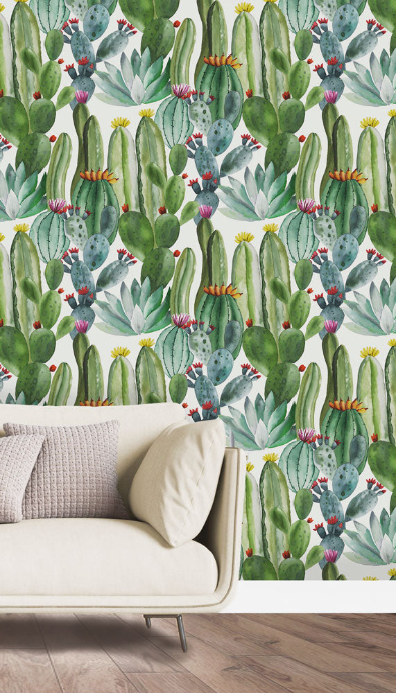 水彩画調のカラフルなサボテンの花が楽しいデザインです。