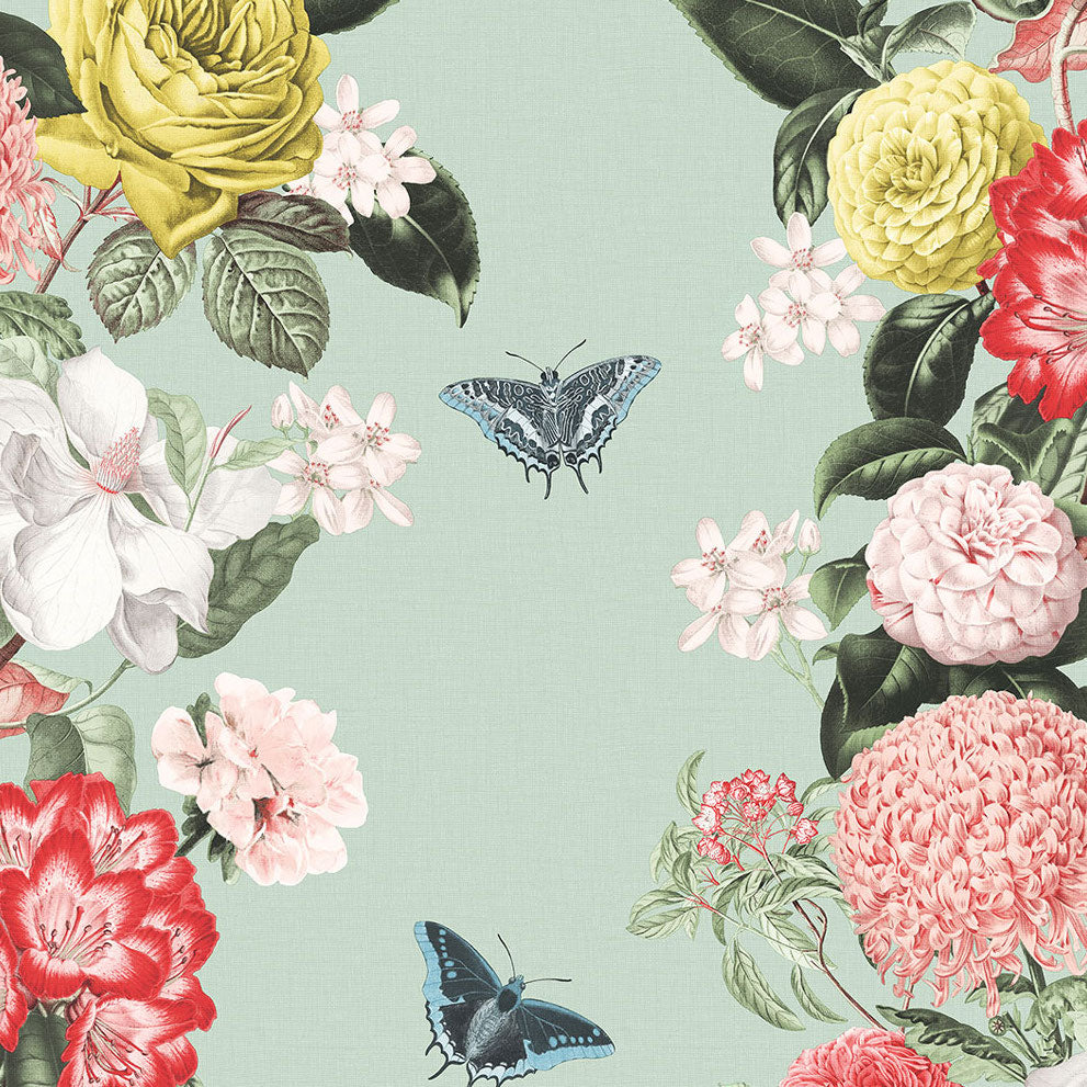 ミントベースに色とりどりの活き活きした花と舞う蝶が描かれ