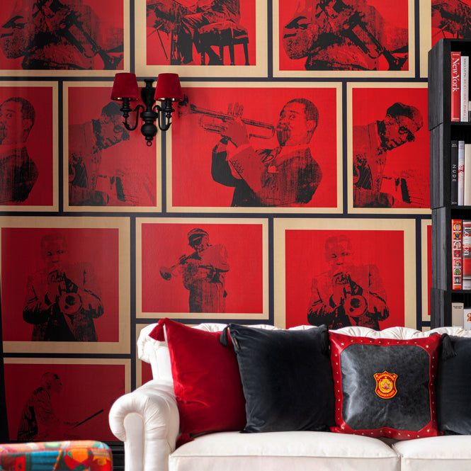 ジャズの帝王と呼ばれるDuke Ellington(デューク・エリントン)が営業していたジャズクラブの「コットン・クラブ」にインスパイアされた壁紙です。ジャズの全盛期に誰でも知っていたミュージシャンの写真をコラージュし、クラブにありそうなギャラリーウォールに。