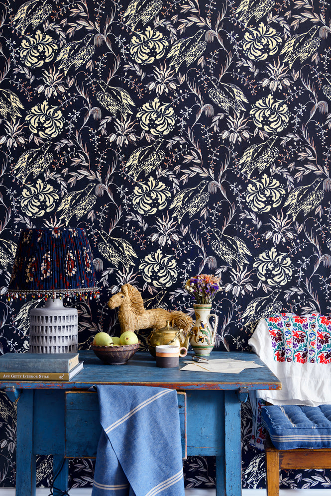 古い刺繍パターンの花や鳥のモチーフをインスピレーションの源として持つTHE FOLK EMBROIDERYの壁紙は、古代の歴史に見られるパターンの豊かさをたどります。